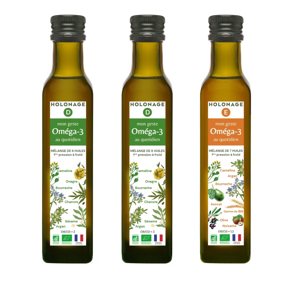 HOLONAGE D : cet assemblage d'huiles présente la particularité d'apporter des oméga-3 mais aussi des oméga-6 qui, grâce à leur haute teneur en acide gamma-linolénique (Onagre, Bourrache, Chanvre), sont également à l'origine de la production de nos propres anti-inflammatoires. Le rapport Oméga-6/Oméga-3 est inférieur à 2.